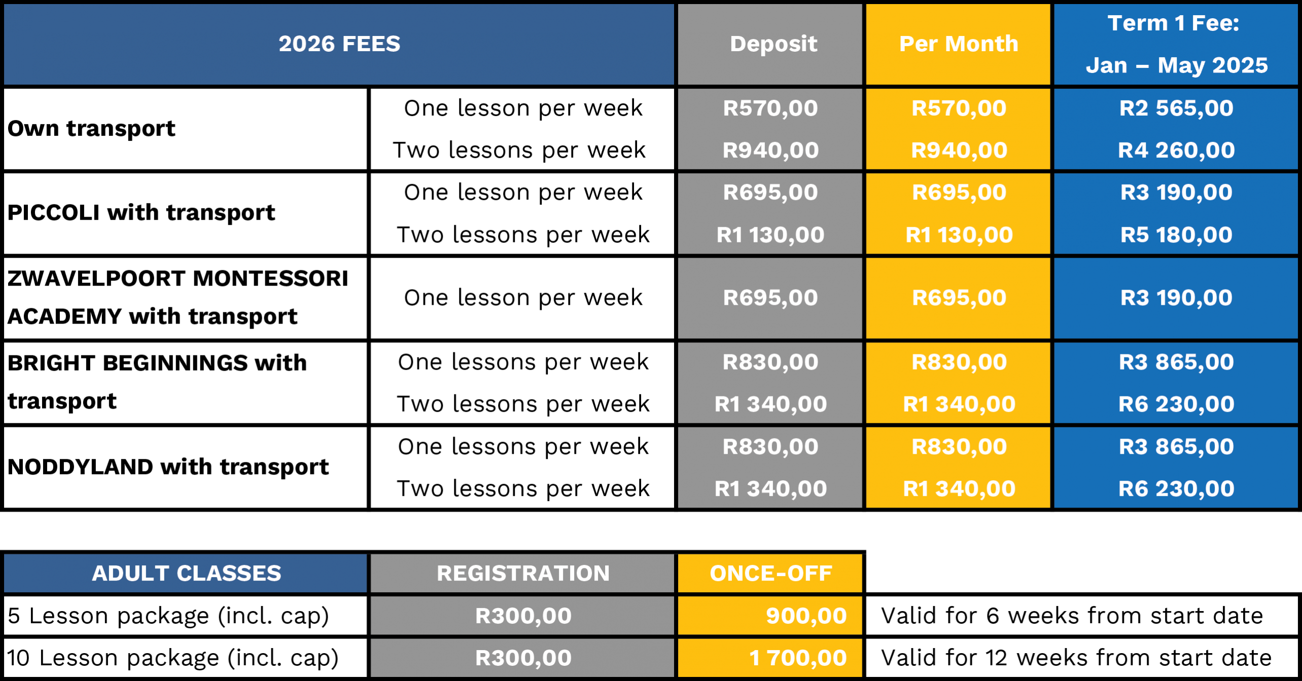 Registration fee of R180 is due at the beginning of each season ... this fee is used for certificates, stickers, awards, galas, etc.